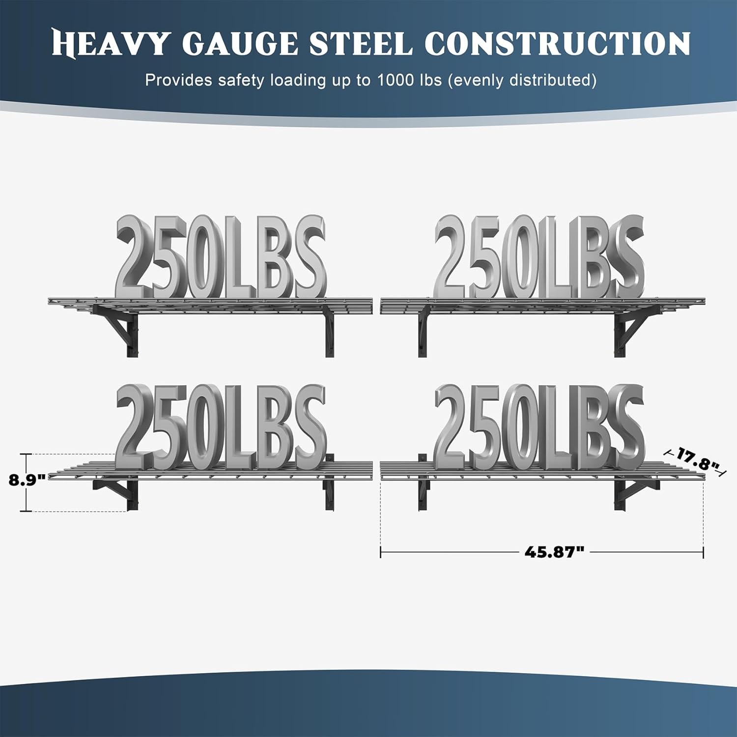 - 🏆【Heavy-Duty Load Capacity】- Jusgym garage shelving wall mounted system is engineered with premium steel, offering exceptional strength. Each 1.5x4ft bracket holds up to 250 lbs, and with 4 shelves totaling 1000lbs capacity, it effortlessly stores bulky items like tools, tires, and heavy storage bins. Built to last, even under extreme weight!