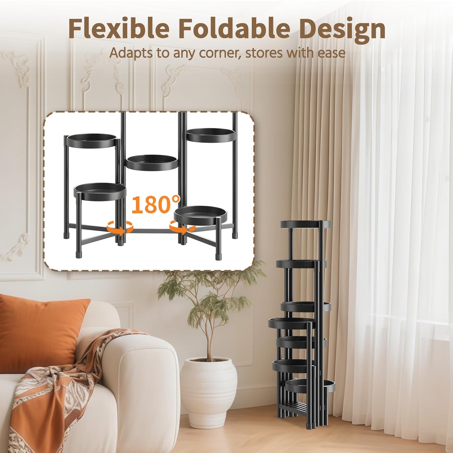 LASZOLA 7 Tiered Folding Plant Stand Indoor for Multiple Large Planter, Tall Heavy Duty Adjustable Rack with Rust Proof 10 Inch Wide Tray, Sturdy Vertical Tree Organizer for Narrow Inside Floor, Black