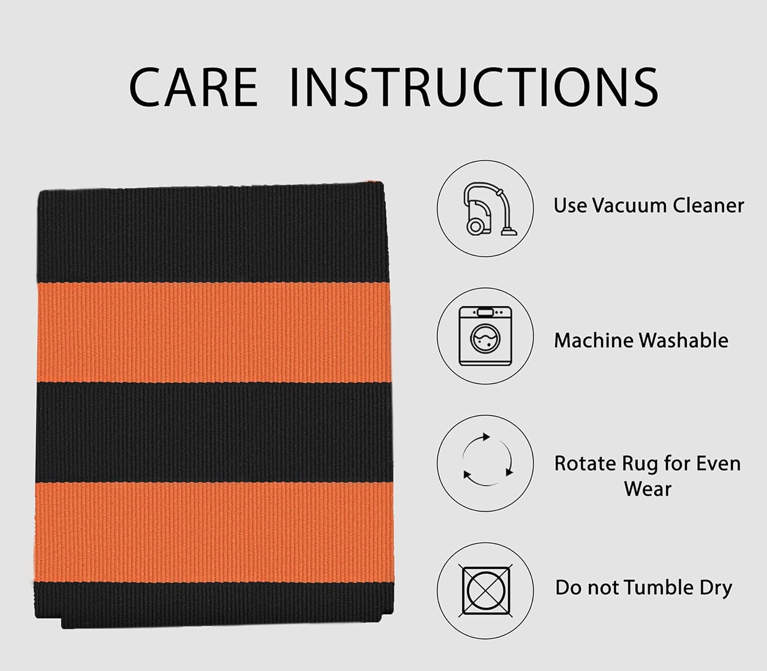- Easy to Clean: This orange and black striped rug is simple to maintain with machine wash or vacuuming to remove dirt. The rug is sturdy and can be tumble dried on low. Keep your door rug fresh and clean with minimal effort. NOTE: Cotton rugs normally shrink slightly after washing