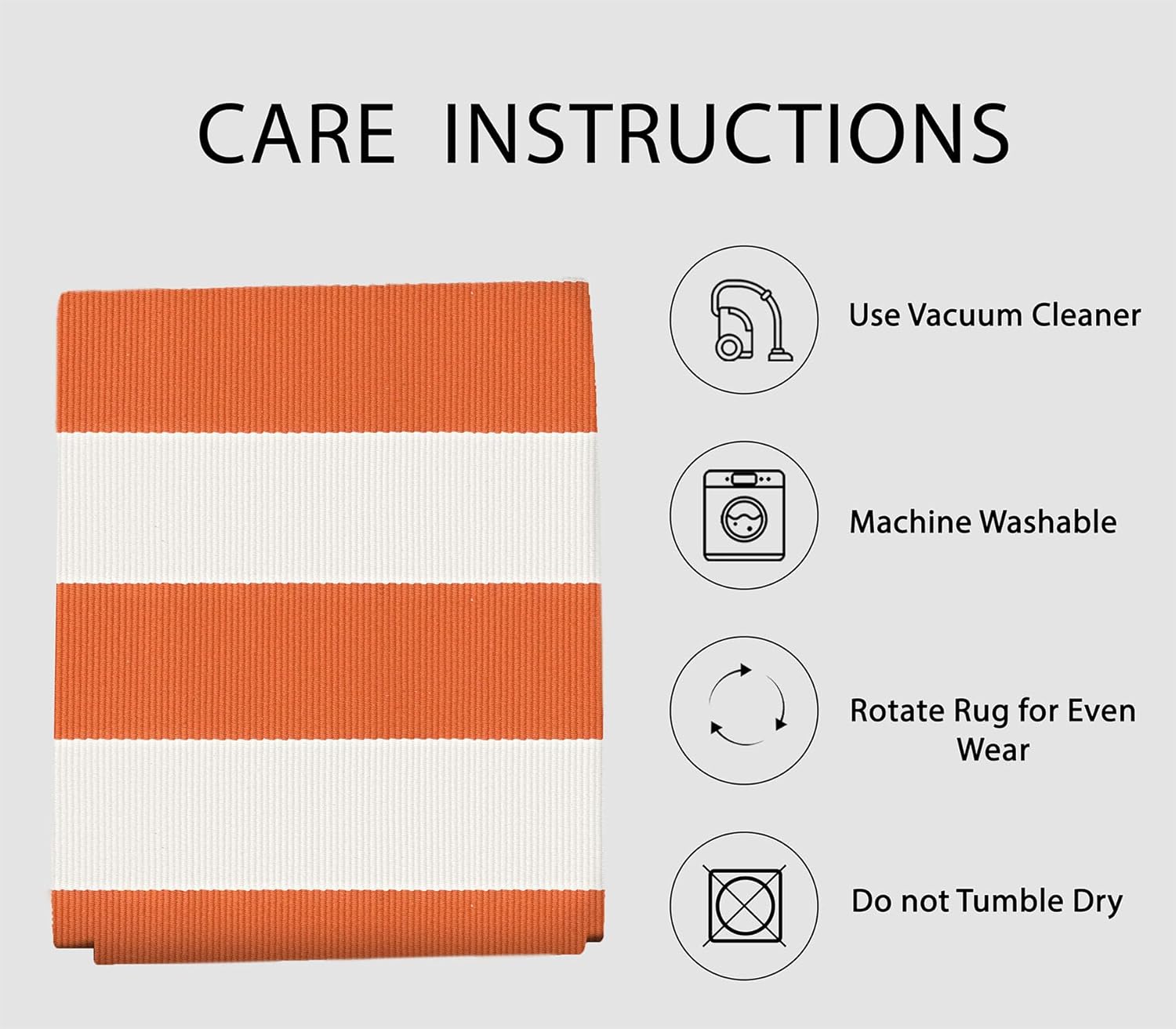 - Easy to Clean: This orange and white striped rug is simple to maintain with machine wash or vacuuming to remove dirt. The rug is sturdy and can be tumble dried on low. Keep your door rug fresh and clean with minimal effort. NOTE: Cotton rugs normally shrink slightly after washing