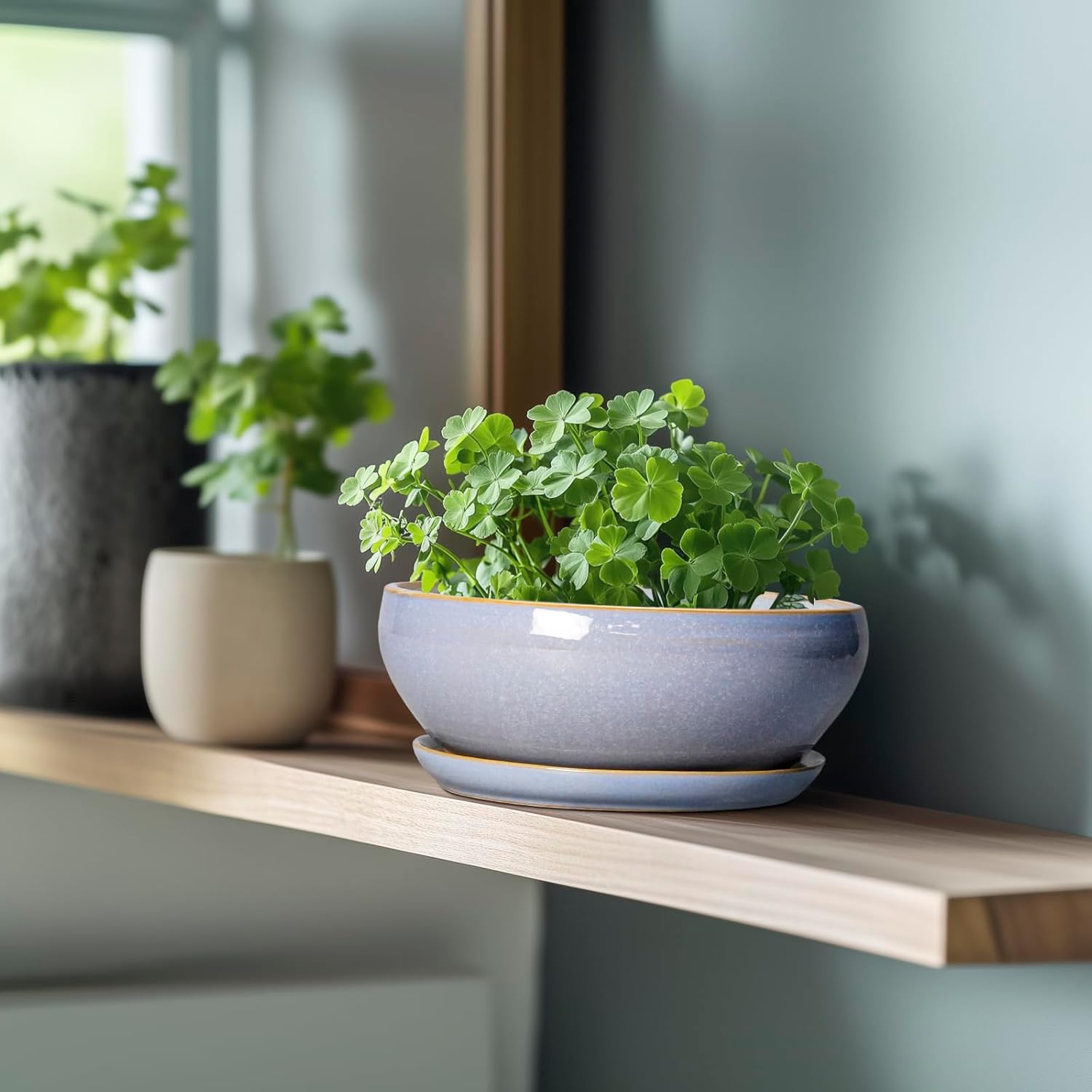 SQOWL Succulent Planters - 8 Inch Ceramic Bonsai Pots with Drainage Hole and Plant Saucer, Shallow Round Planter for Indoor Plants Flower, Bowl Planter Outdoor, Office Decor, House Warming Gift, Blue