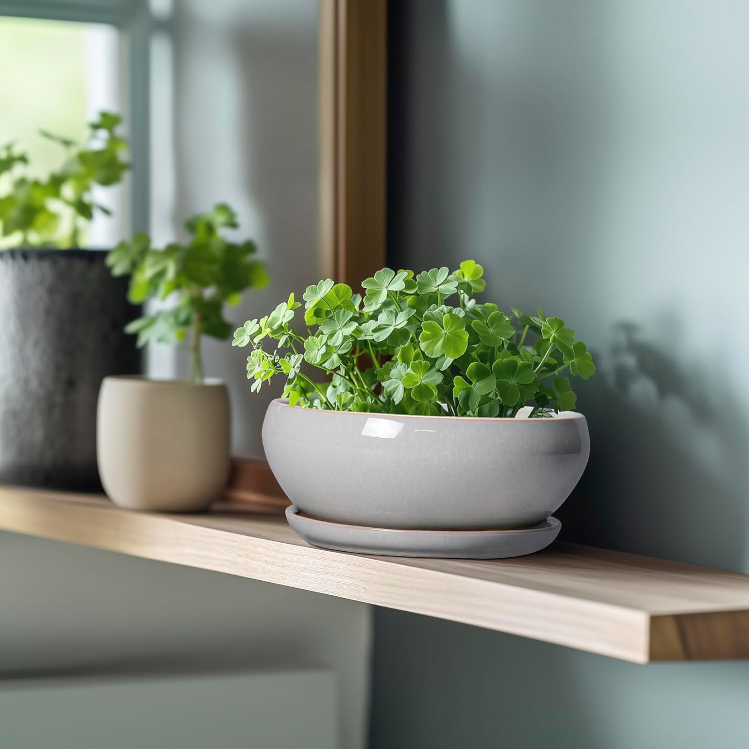 SQOWL Bonsai Tree Pots - 8 Inch Ceramic Plant Pots for Succulents, Shallow Planter with Drainage Hole and Saucer, Round Planter Indoor Outdoor, Bowl Planters, Home Decor, Gift for Plant Lover, Gray