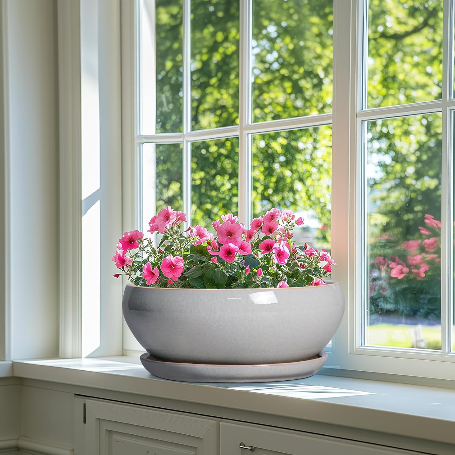 SQOWL 12 Inch Bonsai Pots - Large Ceramic Succulent Pots with Drainage Hole and Saucer, Shallow Planter for Indoor Outdoor Plants Flowers, Round Planter Bowl, Garden Decor, Gifts for Women, Gray