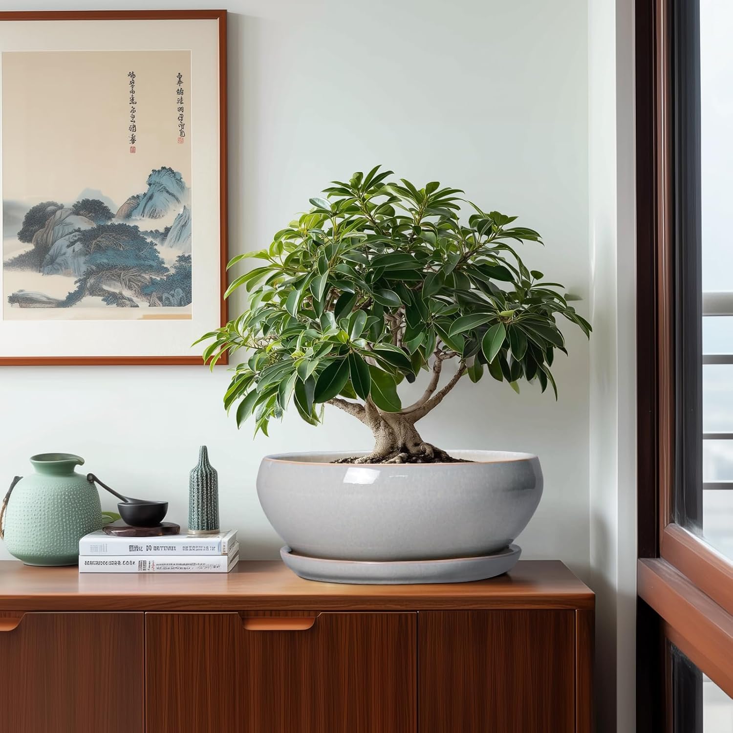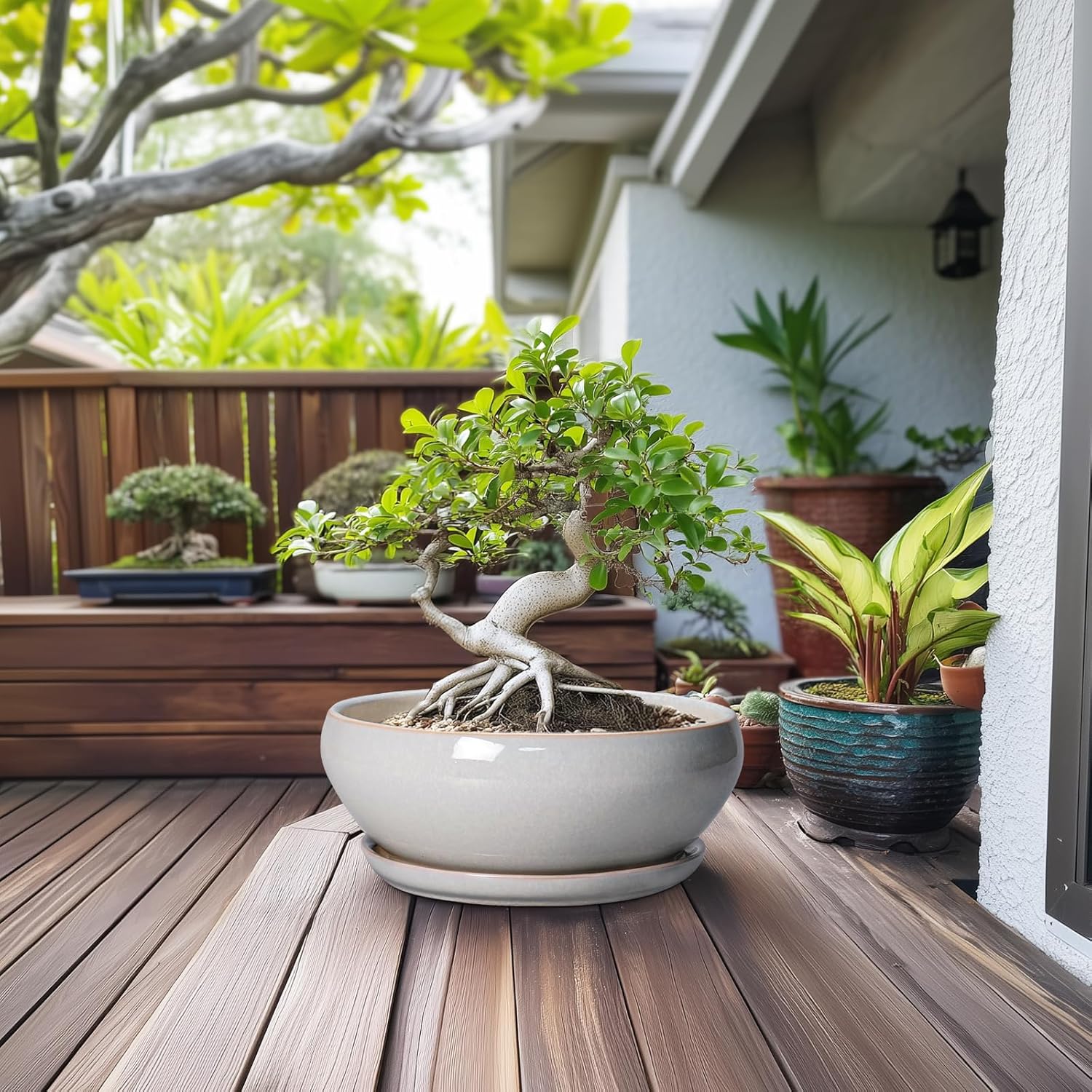 - Sizes and Accessories: The top outer diameter of the bonsai tree pots is 12.2"/ 31.0cm, the waist diameter is 12.6"/ 32.0cm, and the height including tray is 4.7"/ 12.0cm, with a removable ceramic plant saucer and a mesh pad(ONLY CERAMIC PLANTER IS INCLUDED, PLANTS ARE NOT INCLUDED)