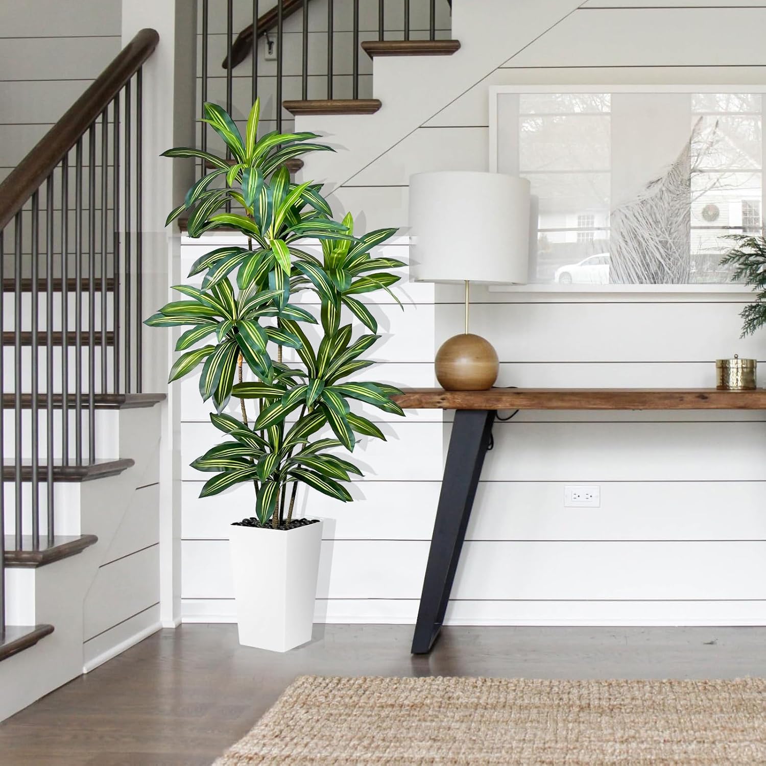 Artificial Dracaena Tree 5FT Tall Fake Plant with White Pot - Realistic Faux Dragon Tree with Tall Planter - Indoor Floor Plant for Home, Office,Mall, Living Room, Bedroom Decor (White - Planter, 5ft)