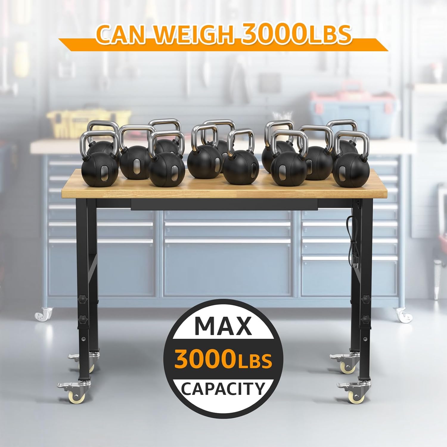 48" Adjustable Workbench,Heavy-Duty Work Table,3000 LBS Load Capacity Hardwood Workstation Outlets with Power Strips, Drawers and Wheels,for Workshop, Garage