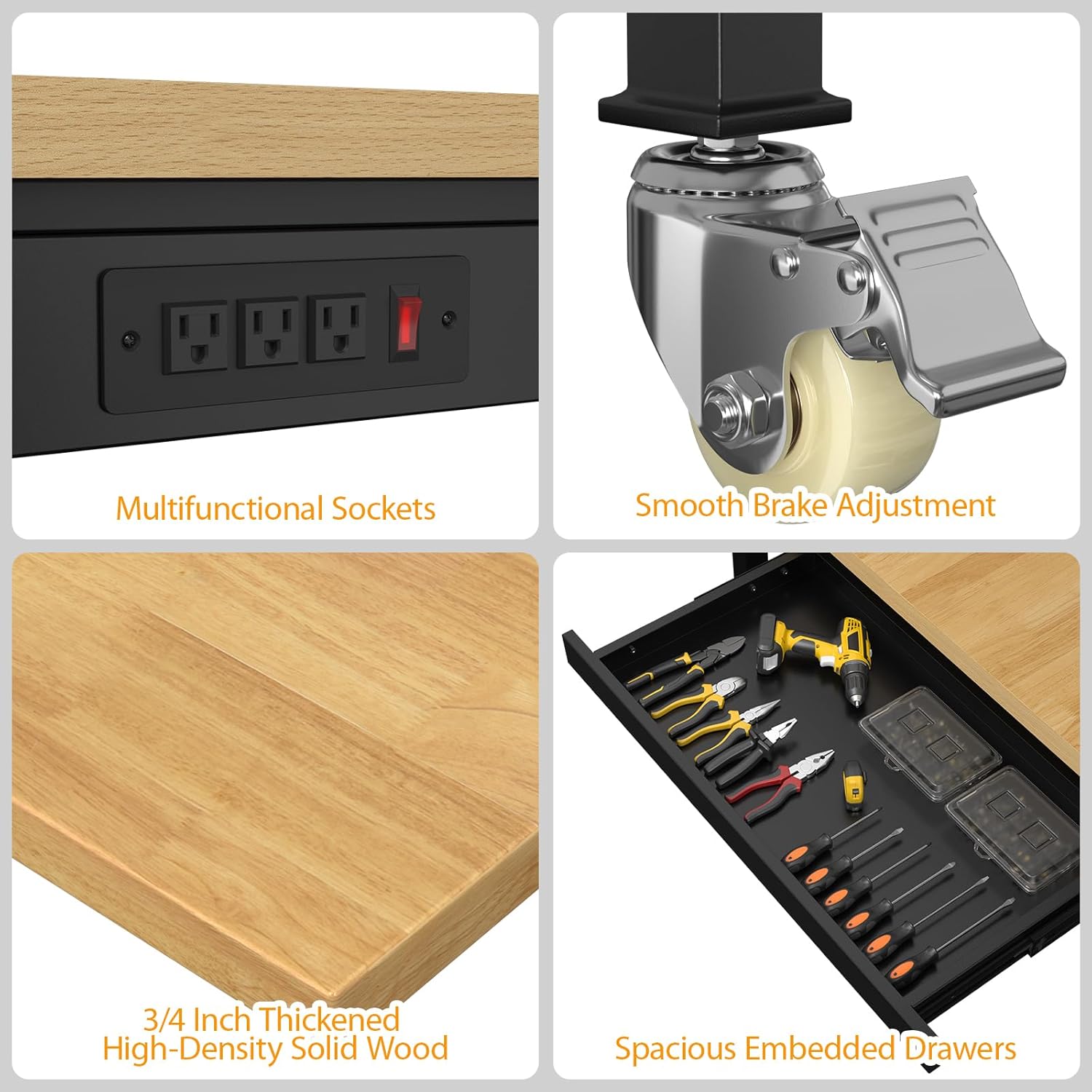 - Power Outlets:Our workbench comes with a built-in power strip, includes a 6.56 ft cable, 3 AC outlets, making it convenient to use various power tools and lighting.Eliminating the hassle of searching for available outlets.Similarly, our work table is equipped with drawers to facilitate your storage of various items