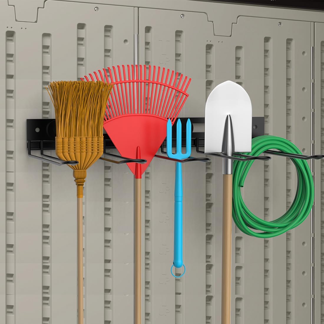 - Efficient Storage: The storage rack provides ample hanging space for your storage shed, allowing you to neatly store and organize various garage tools and equipment, such as folding beach chairs, ladders, brooms, shovels, rakes, cords and more