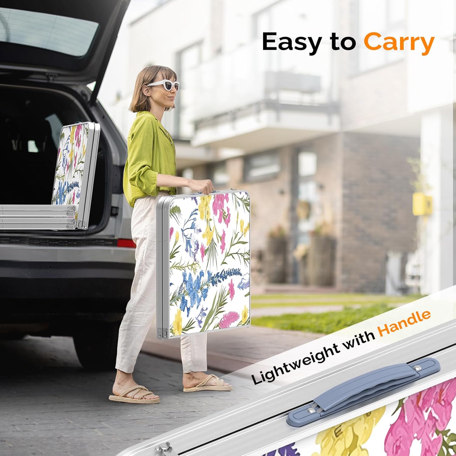- LIGHTWEIGHT&FOLDABLE: MDF tabletop and aluminum feet make its weight just 9.9 lbs. The feet could be set off and tabletop could fold in half, foldable like suitcase(23.8"*23.8"). It is convenient to carry it to anywhere with its soft carry handle.