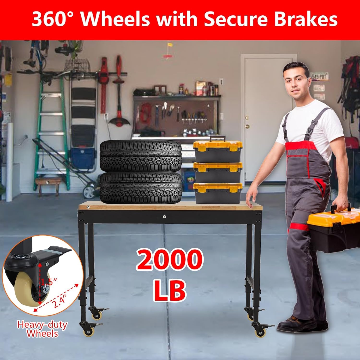 - Smooth Mobility & Stability: Move your garage workbench effortlessly with four lockable wheels—ideal for shifting between indoor and outdoor workspaces. Prefer a stationary setup? Switch to the included flat feet for a rock-solid work table for garage projects.The choice is yours for maximum convenience.