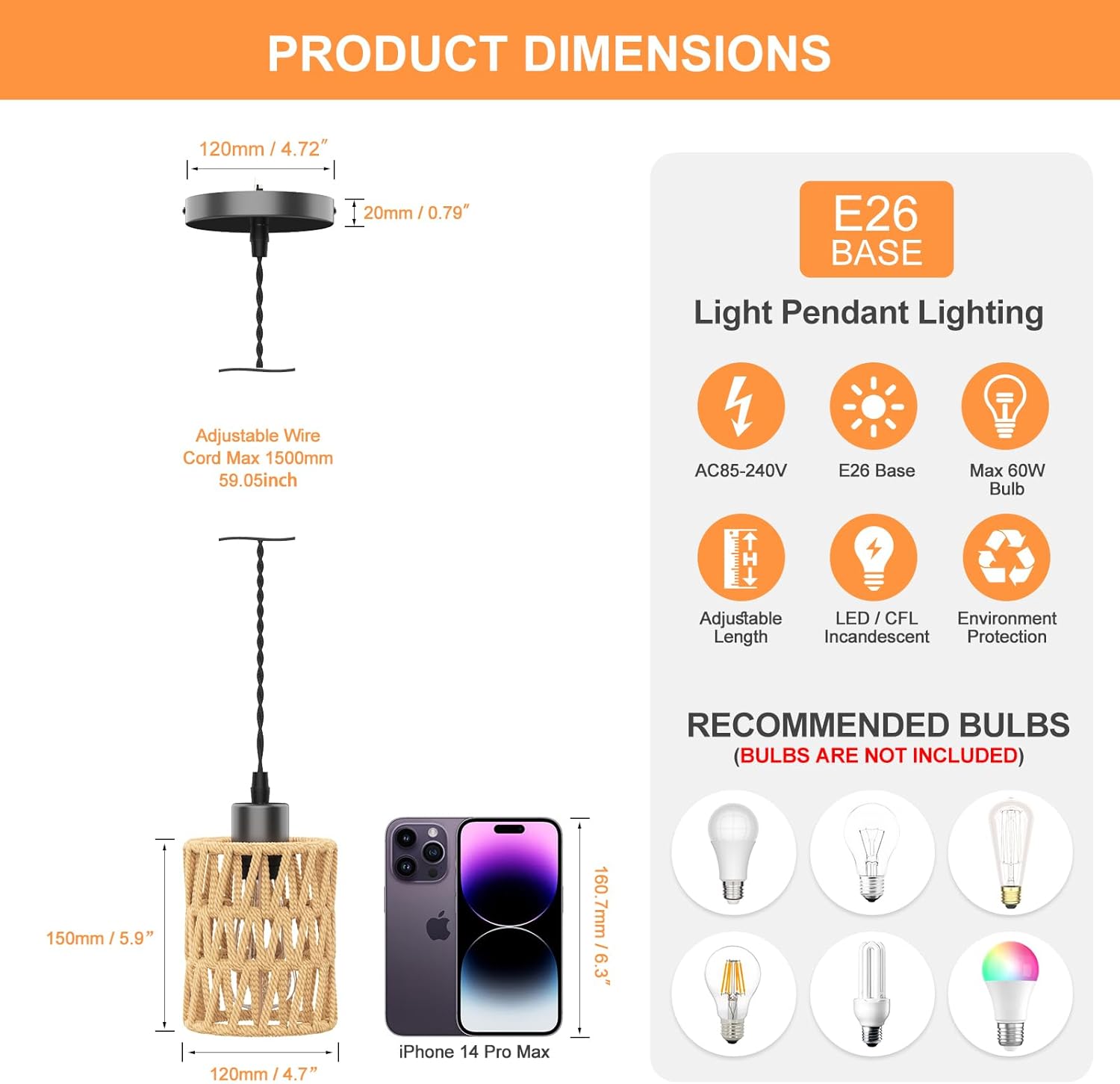 - 💡 【UL-Certified Socket& Bulb Compatibility】This E26 socket pendant light is UL-listed for safety and works with LED,incandescent,vintage filament,and halogen bulbs (max 60W). Choose warm white (2700K–3000K) for a cozy glow or bright white (4000K–5000K) for task lighting—bulb not included.