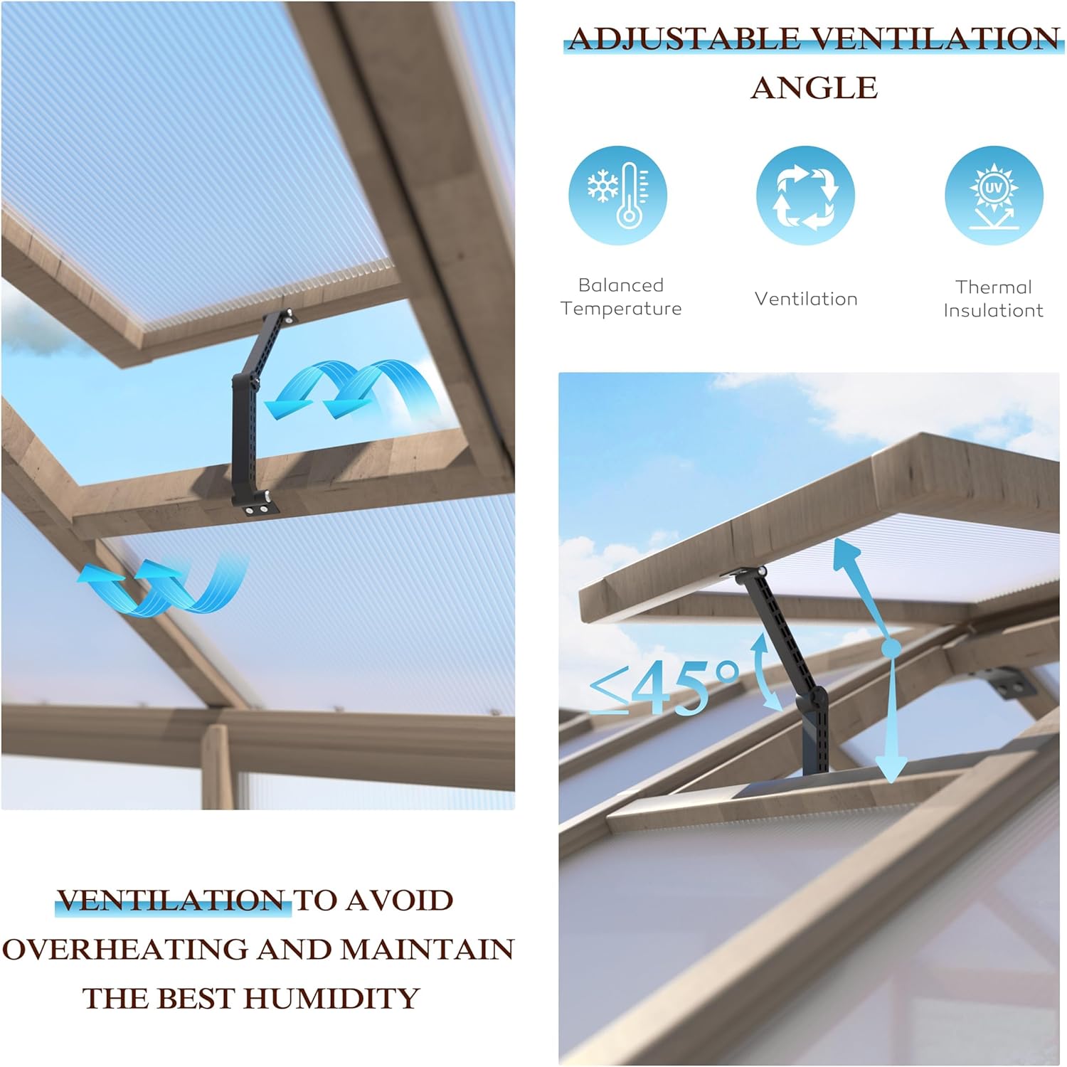 - Adjustable Roof: Our wooden outdoor greenhouse is designed with adjustable roof which is fixed with the joint to adjust the opening angle. You can adjust the angle to meet you needs, and the maximum opening angle is 45 degree. Adjustable roof design provides UV protection while ensuring temperature balance and air circulation