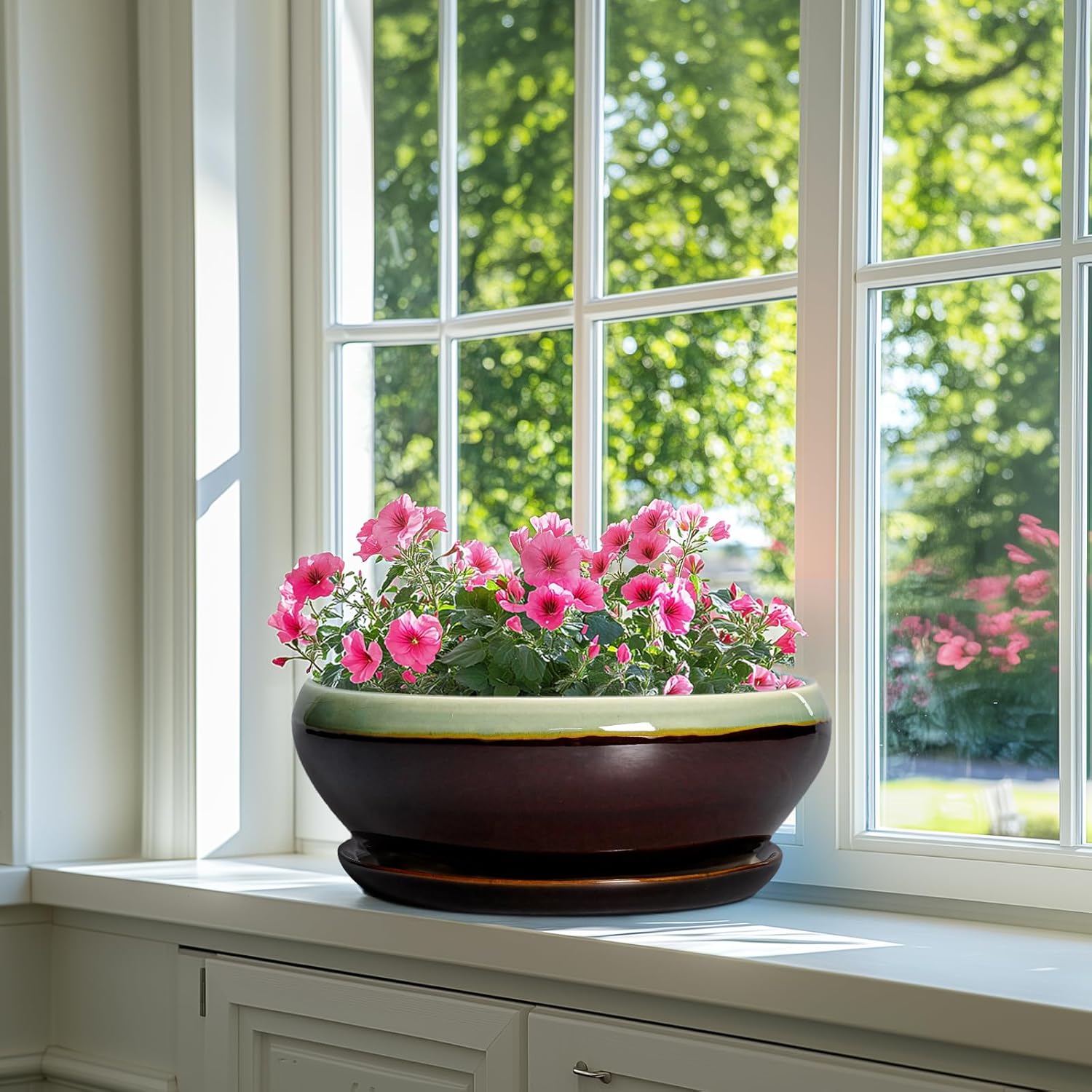 SQOWL Bonsai Pots 12 Inch - Large Ceramic Pots for Succulents with Drainage Hole and Saucer, Shallow Planter for Indoor Plants Outdoor, Round Planter Bowl, Office Decor, Gifts for Women, Green-Brown