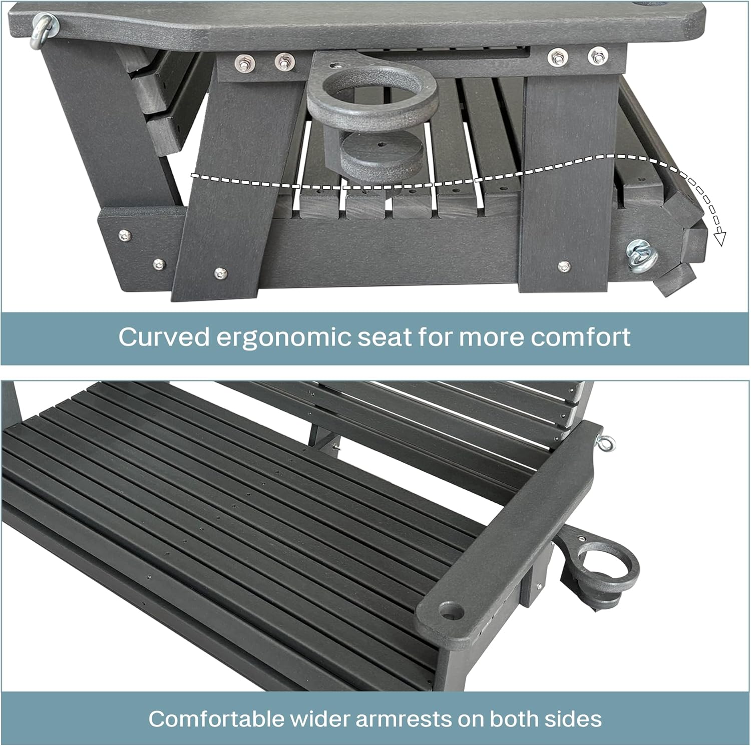 HDPE Porch Swing with 18/8 Stainless Steel Bolts, Ergonomic Design, Ultra Weather-Resistant, Heavy Duty 1200 LBS, for Outdoor Patio Garden Yard (Gray)