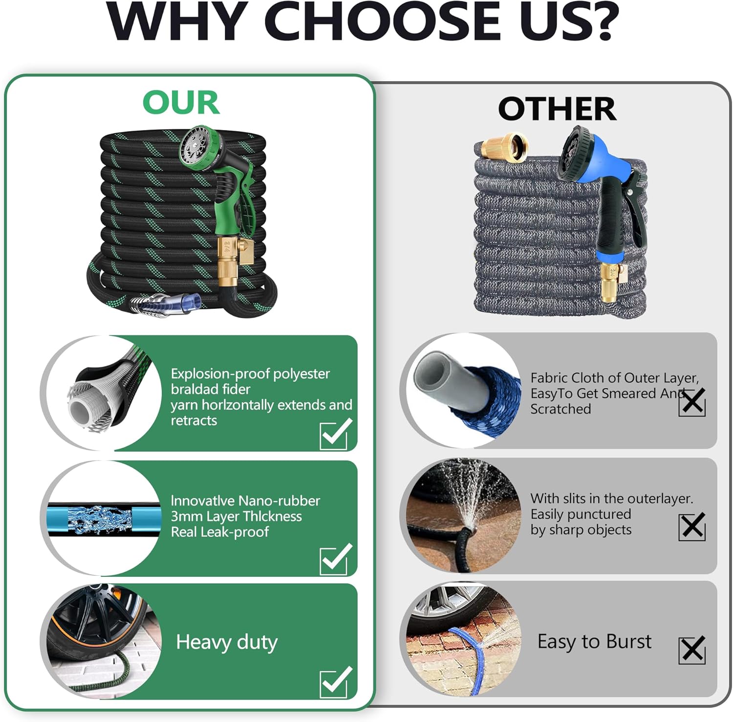 - Fitting: Solid 3/4 inch brass connectors ensure the garden water pipe fits the typical outdoor garden taps in the US. Enjoy our high-quality garden hose that Designed by engineer team