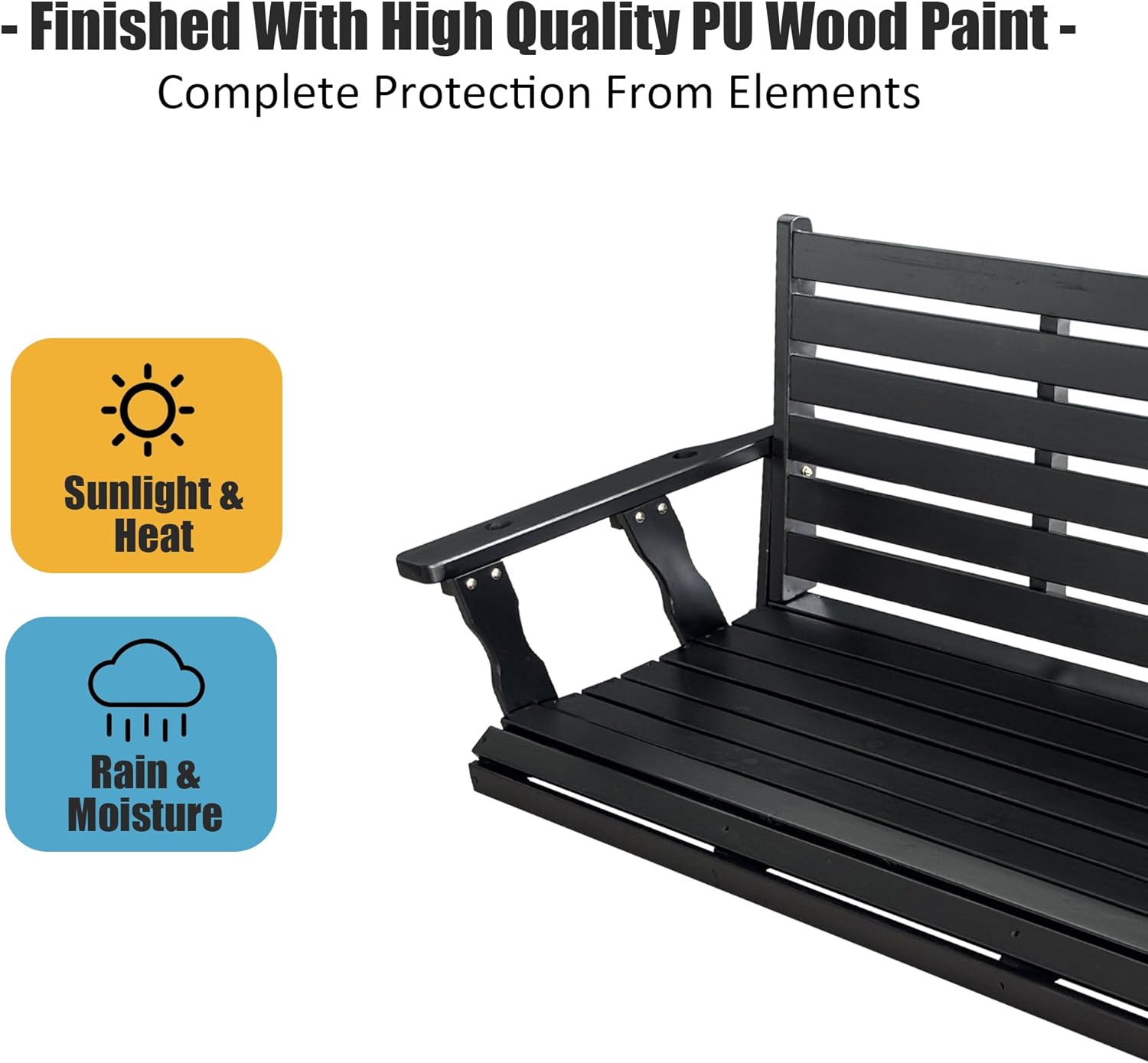 - ๐๐๐๐ญ๐ก๐๐ซ ๐๐๐ฌ๐ข๐ฌ๐ญ๐๐ง๐ญ: Finished with a long-lasting PU wood paint that thrives in covered outdoor spaces, this swing retains its beauty for years; every surface is sealed for complete protection, while coated screws and chains resist rust; for open-yard use in strong sun and heat, we suggest applying a yearly protective coat to shield against weather and UV damage