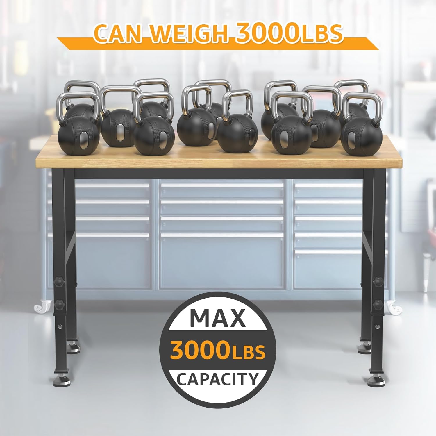 - Unmatched Loading Capacity: The maximum load bearing of the garage workbench is up to 3000 LBS.You can place large or heavy machinery on the hardwood workbench for processing with confidence.