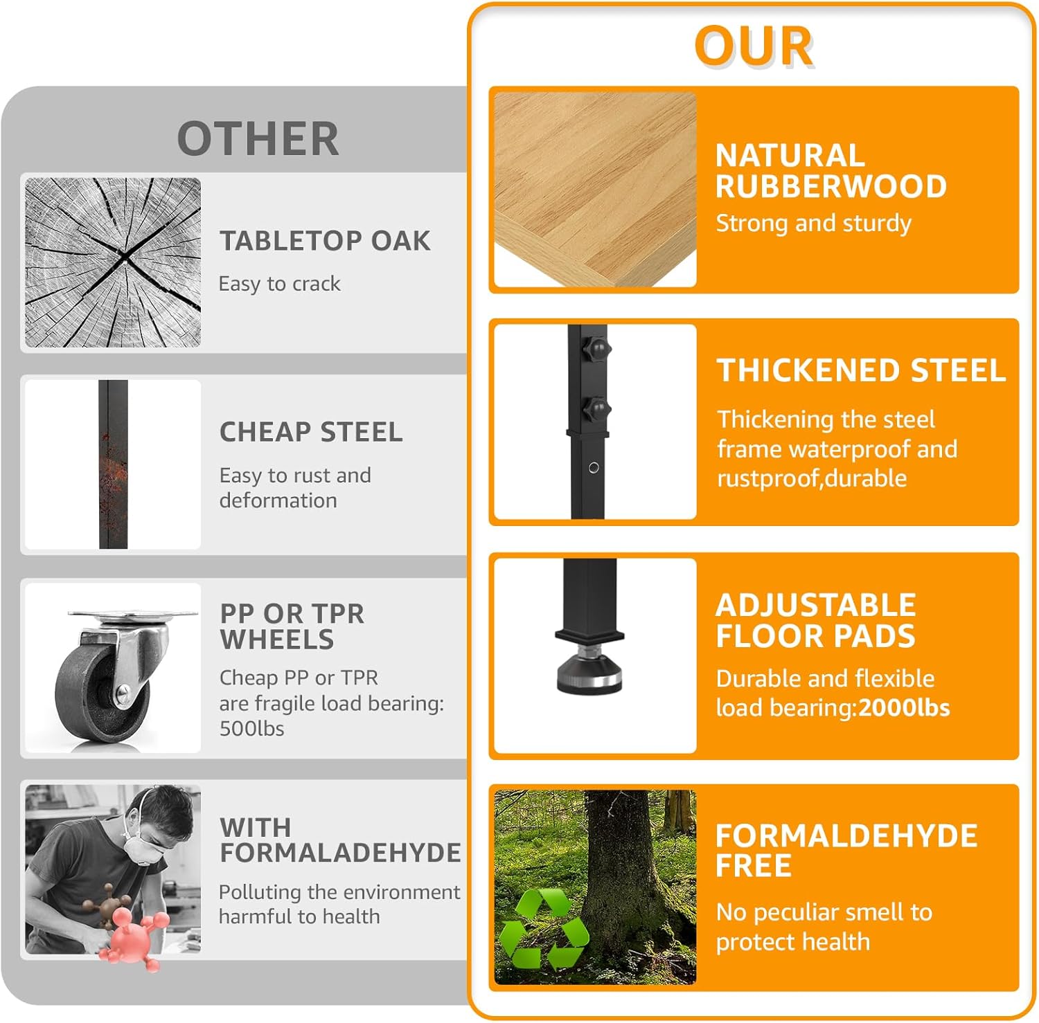 - Stable Construction:The frame of the work table is made of cold-rolled steel plates, which are very sturdy. Several thick crossbars keep the table stable when loaded.Meanwhile, the adjustable workbench is equipped with 4 rubber feet,effectively stopping it from sliding and protecting your floor. Moreover, all accessories, required tools, and detailed installation instructions are included, making it easy to assemble the heavy-duty workbench.