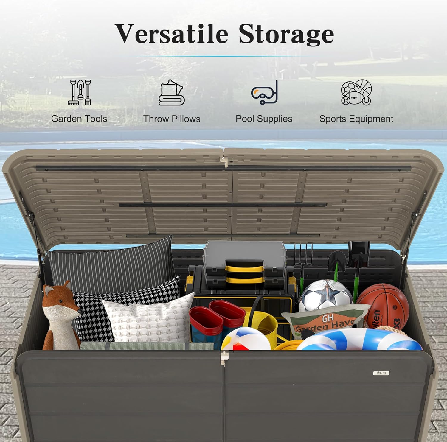 Domi 200 Gallon Resin Deck Box, Waterproof & UV-Resistant Outdoor Large Storage Box Lockable Storage Bin for Patio Cushions Pool Supplies Garden Tools and Delivery Storage