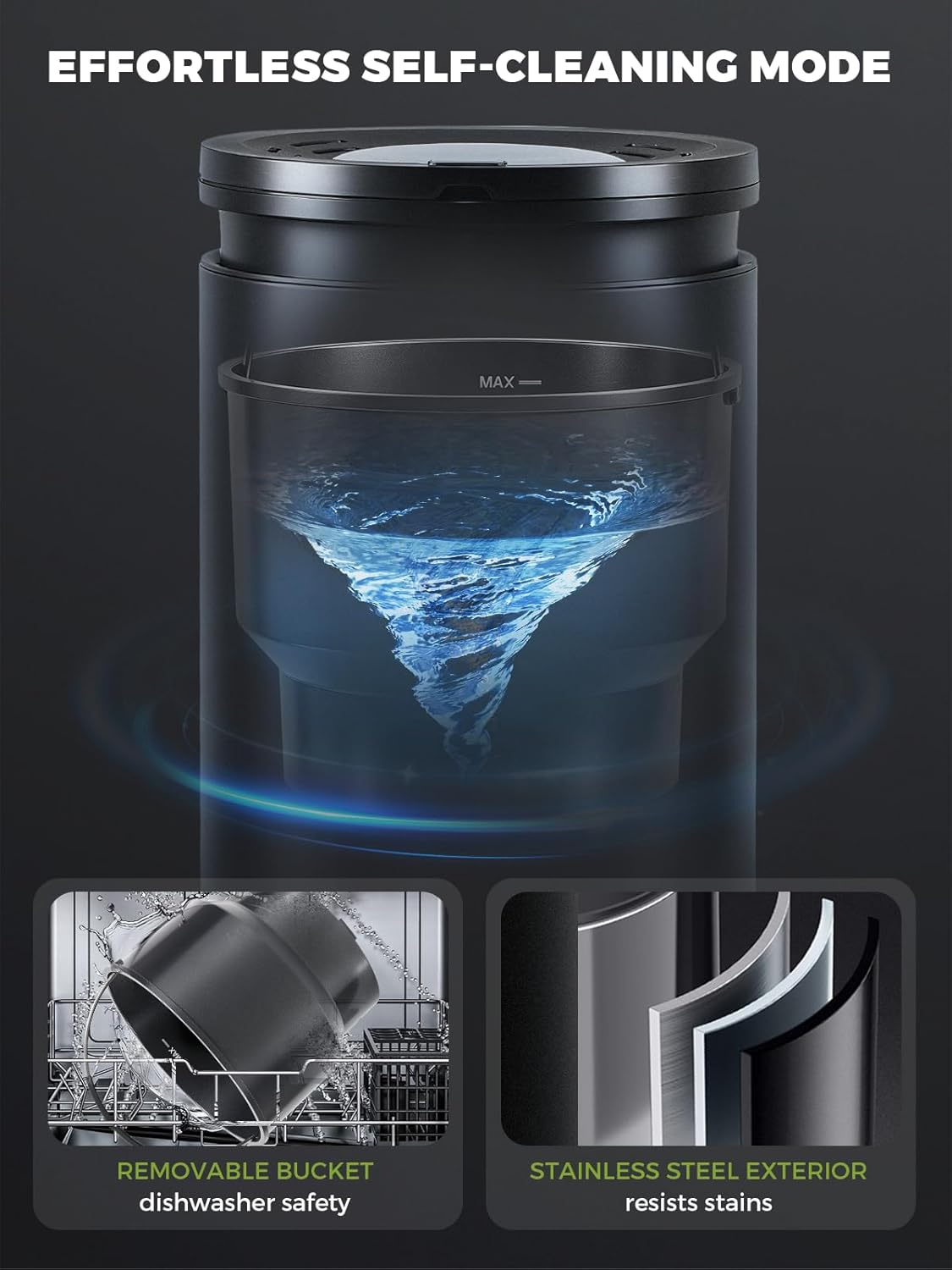 - User-Friendly Operation & Effortless Cleaning: This Auto Food Recycler has an intuitive control interface and LED display screen. With just one-touch operation, it can automatically run in the mode you needs, enjoying the convenience of smart composting. A built-in cleaning mode ensures quick clean, while the dishwasher-safe removable bucket enables thorough cleaning; the stainless steel exterior resists stains and helps effortlessly maintain cleanliness