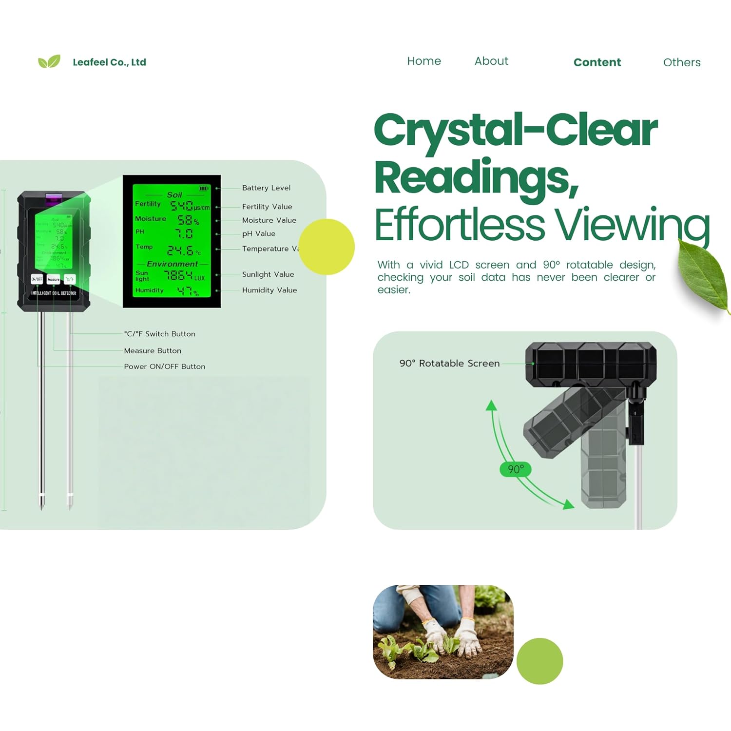 - 🖥️【More Convenient to Read】The screen features a user-friendly design with clear visuals, making it easy for users to interpret data through specific values. This guarantees that even beginner growers can quickly understand their soil conditions. Additionally, the 90° rotating head allows you to adjust the angle from 0° to 90°, facilitating effortless viewing without the need to bend over.