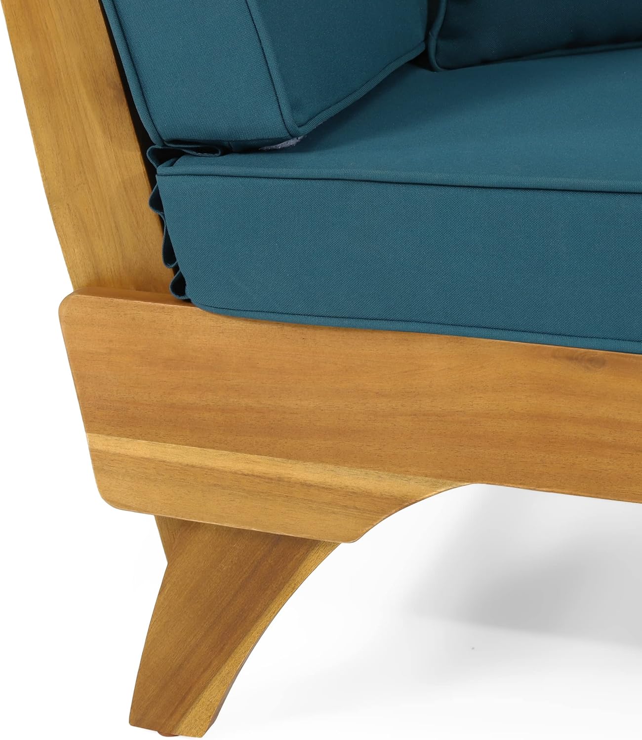 Outdoor Adjustable Patio Wooden Serene Daybed Sofa Chaise Lounge with Cushions for Small Places, Sleeper Chair with Armrest for Backyard, Poolside (Blue)