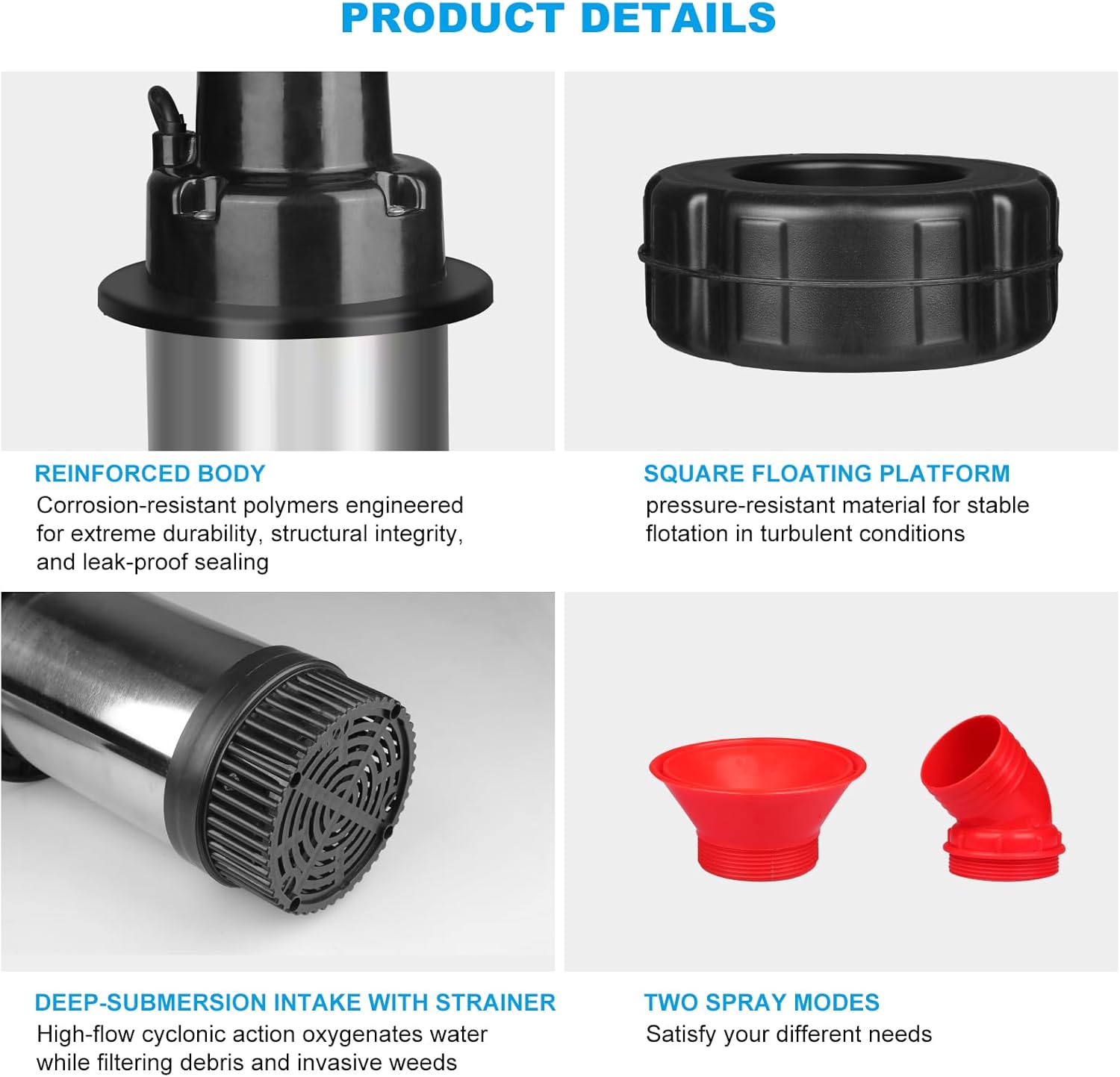 - 【Sturdy & Efficient Construction】Designed for large ponds, our pond fountain aerator features a stainless steel housing and a corrosion-resistant all-copper motor. The thicker cable enhances safety and power transmission, while the filtered intake prevents debris and weeds, ensuring smooth water flow and pump protection.