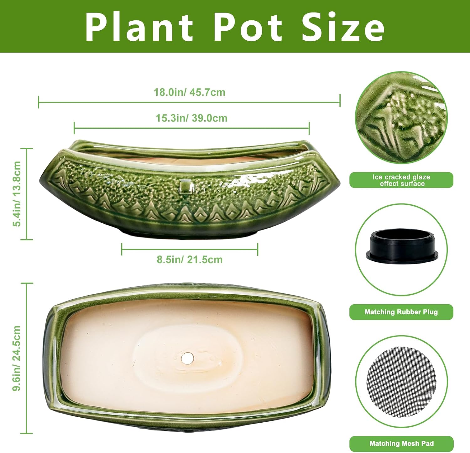 - Sufficiently Large Size: Our ceramic plant pot is 18.0''/45.7cm X 9.6''/24.5cm X 5.4''/13.8cm. Packaging Includes: a ceramic planter, drainage plug, and mesh pad. Thoughtfully packaged to ensure your bonsai tree pot arrives in complete condition