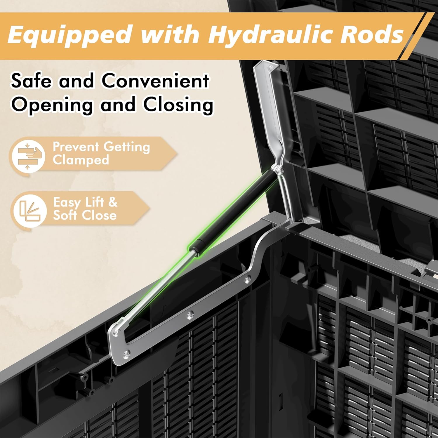 - π Hydraulic Lid with Lockable Design for Safe Access Equipped with hydraulic gas lift rods, the lid opens smoothly and closes gently to prevent pinched fingers. The lockable lid adds an extra layer of security, making it an ideal choice for shared outdoor spaces or secure backyard storage. (Lock not included)