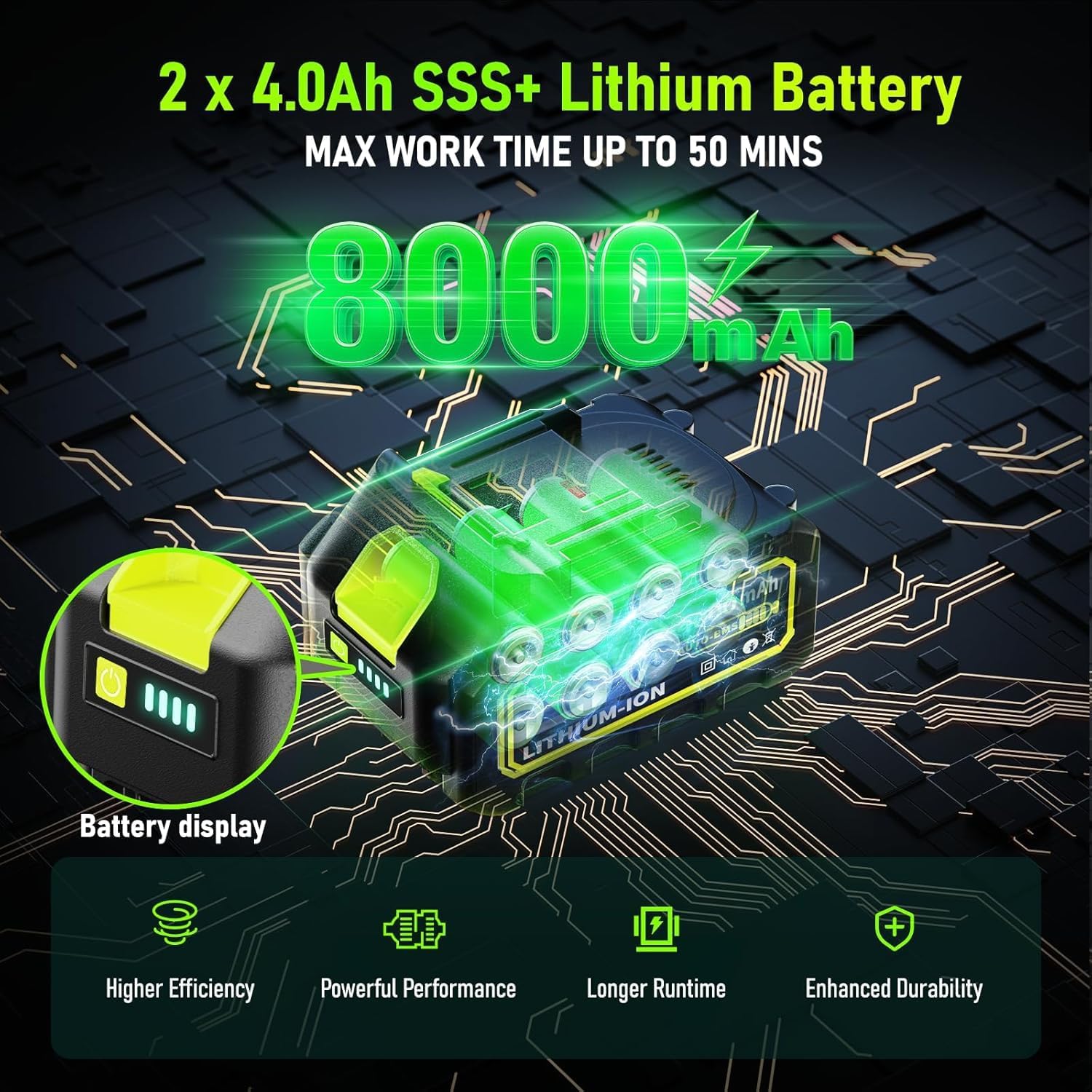 - 【Two Batteries, Zero Interruptions】 Equipped with two 21V 4000mAh batteries, the leaf blower cordless can run for up to 50 minutes. The power display shows remaining charge, and the fast charger gets you back to work quickly. No cords, no hassle.