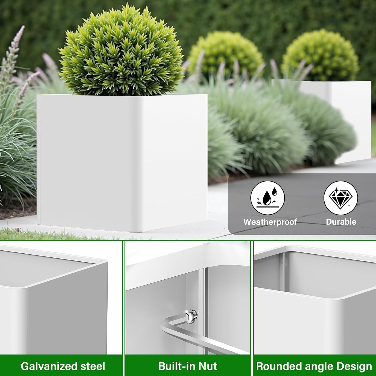 - 【Modern Design】:Our Metal planter box is designed with rounded corners on the side, prevent from bumping.It aslo equipped with pre-drilled drainage holes, this planter box ensures efficient water management, preventing the risk of overwatering your plants.