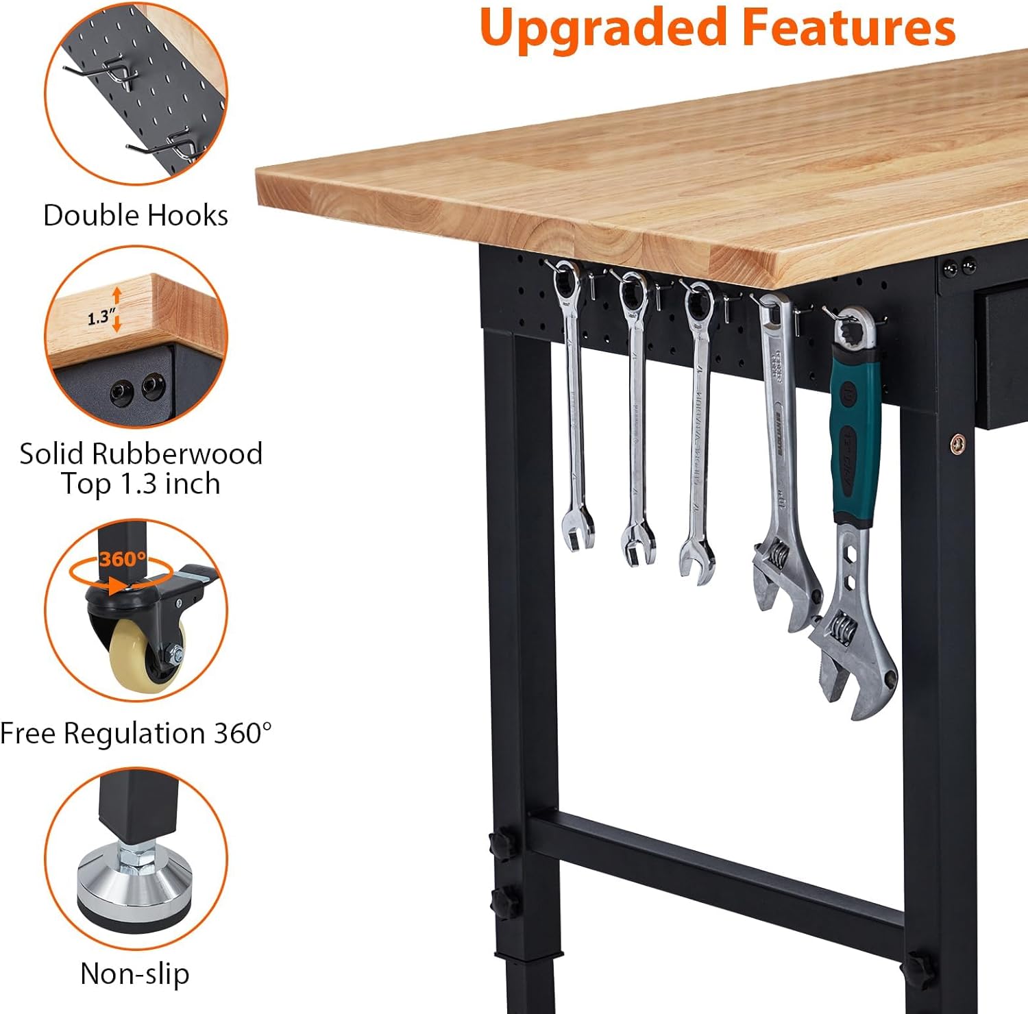 - 【Solid Rubberwood and Thick Steel Leg Construction】Coating and Durability: Finely coated and polished for long life and easy cleaning. 1.3mm thick steel frame for robust support. Supports up to 2000 lbs, ideal for heavy-duty tasks like auto repair and gardening.