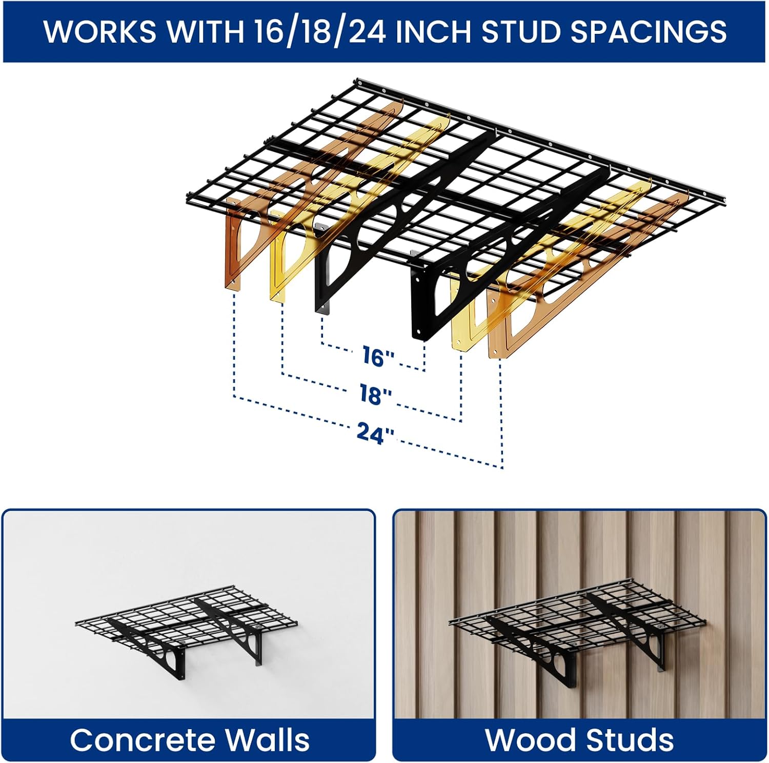 - Suitable for wood stud spacing of 16", 18" or 24". NOTE: The shelves can only be installed separately for 24" studs. Can NOT be mounted to metal wall.