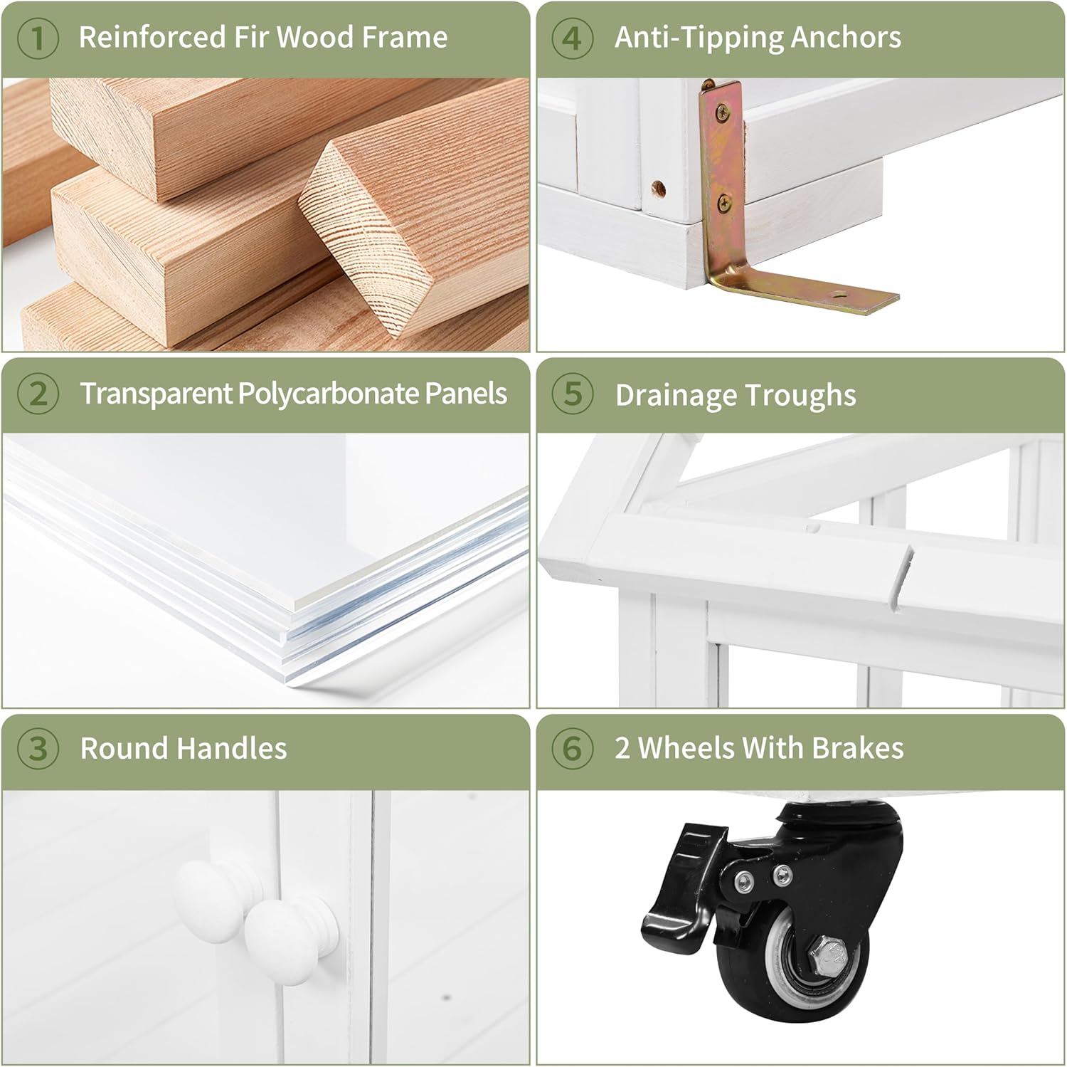 - Durable Fir Wood & Polycarbonate Panels β Built with 100% natural fir wood and UV-resistant polycarbonate panels that diffuse sunlight evenly, protecting plants from harsh rays while maintaining optimal growth conditions for seedlings, herbs, and winter crops.