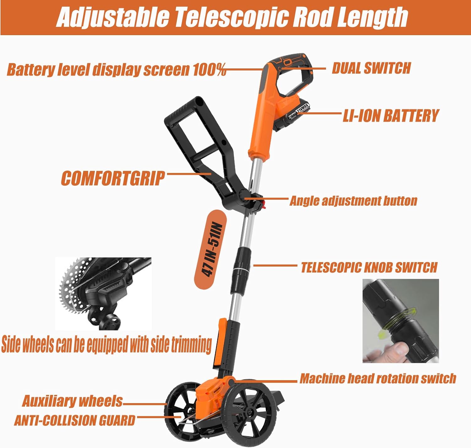 - ADJUSTABLE HEIGHT & ROTATING HEAD: The handle adopts ergonomic design Adjustable length of telescopic shaft which total length is about 41- 57inch, weight is only 4.5 pounds, The angle of the String Trimmer Cordless head can be adjusted (0-90Β°) at will to fit for most complex working environments. women and the elderly can easily use. allowing you to easily care for any hard-to-reach nooks and crannies