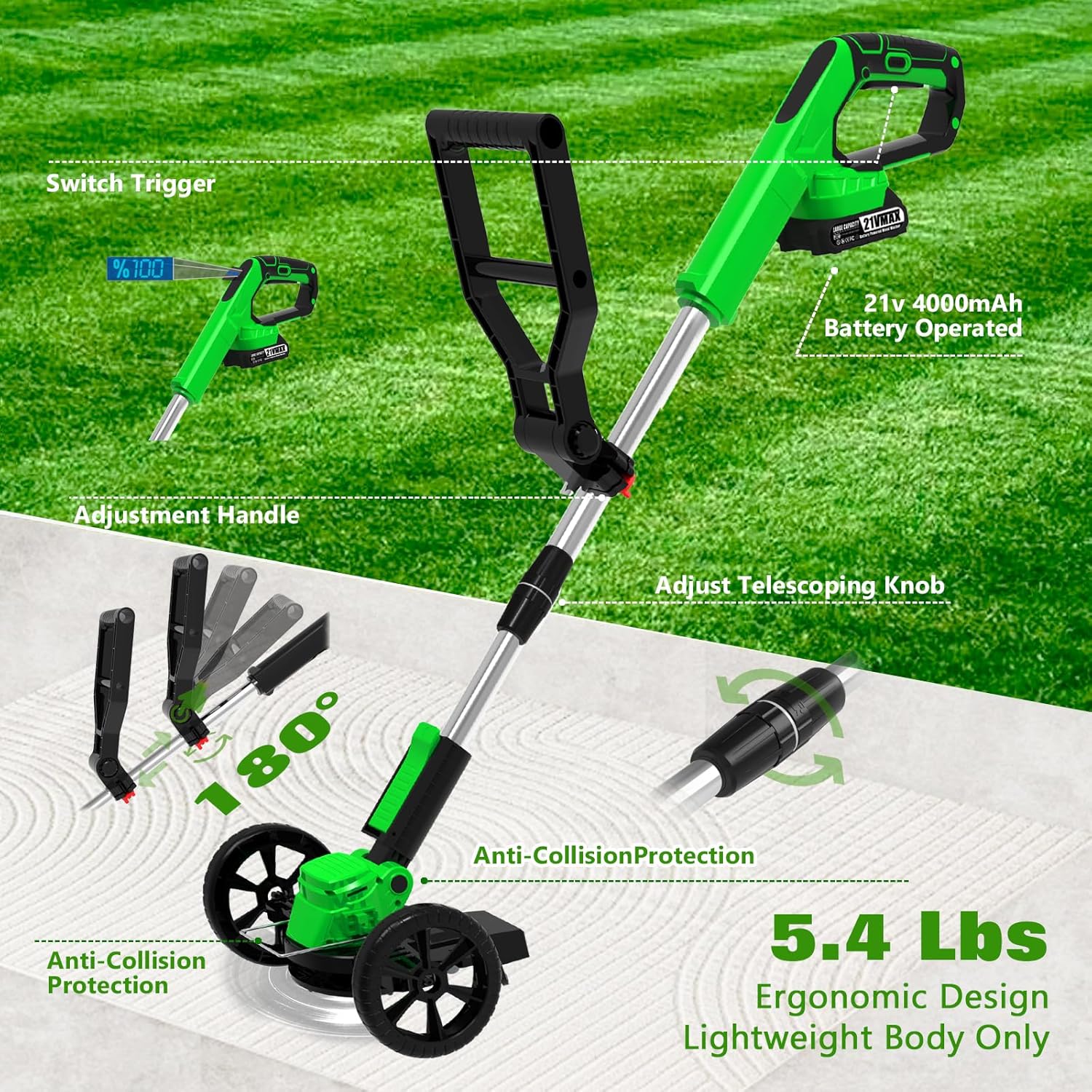 - 【Ergonomic Trimmer Grip & Adjustable Height & Rotating Head】The battery operated weed wacker with extra labor-saving handle, you don't need to bend down. Work in the most comfortable position and greatly reduce stress on your back and waist. The adjustable telescoping pole adjusts in length from 41- 57 inches to provide the length everyone needs. The no string weed wacker head angle is adjustable from 0-90°, allowing you to easily care for any hard-to-reach nooks and crannies