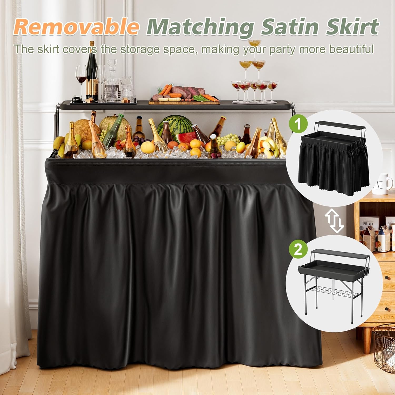 - Removable Table Skirt: Our ice cooler table comes with a removable, washable table skirt that is aesthetically pleasing. A metal shelf can also be installed on the bottom to provide you with extra storage space