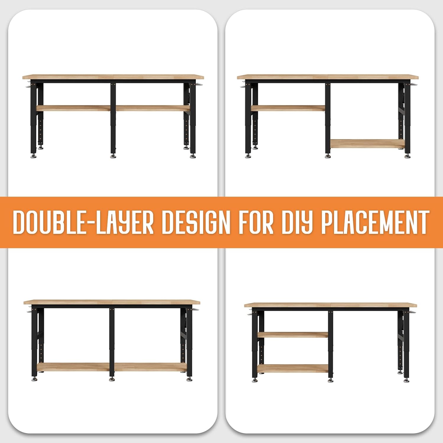 - 【Max 2000lbs Capacity & Solid Wood Top】Built with an industrial steel frame and 1.2" thick solid rubber wood top, this heavy duty workbench supports up to 2000 lbs evenly distributed—ideal for shop, garage, or office.
