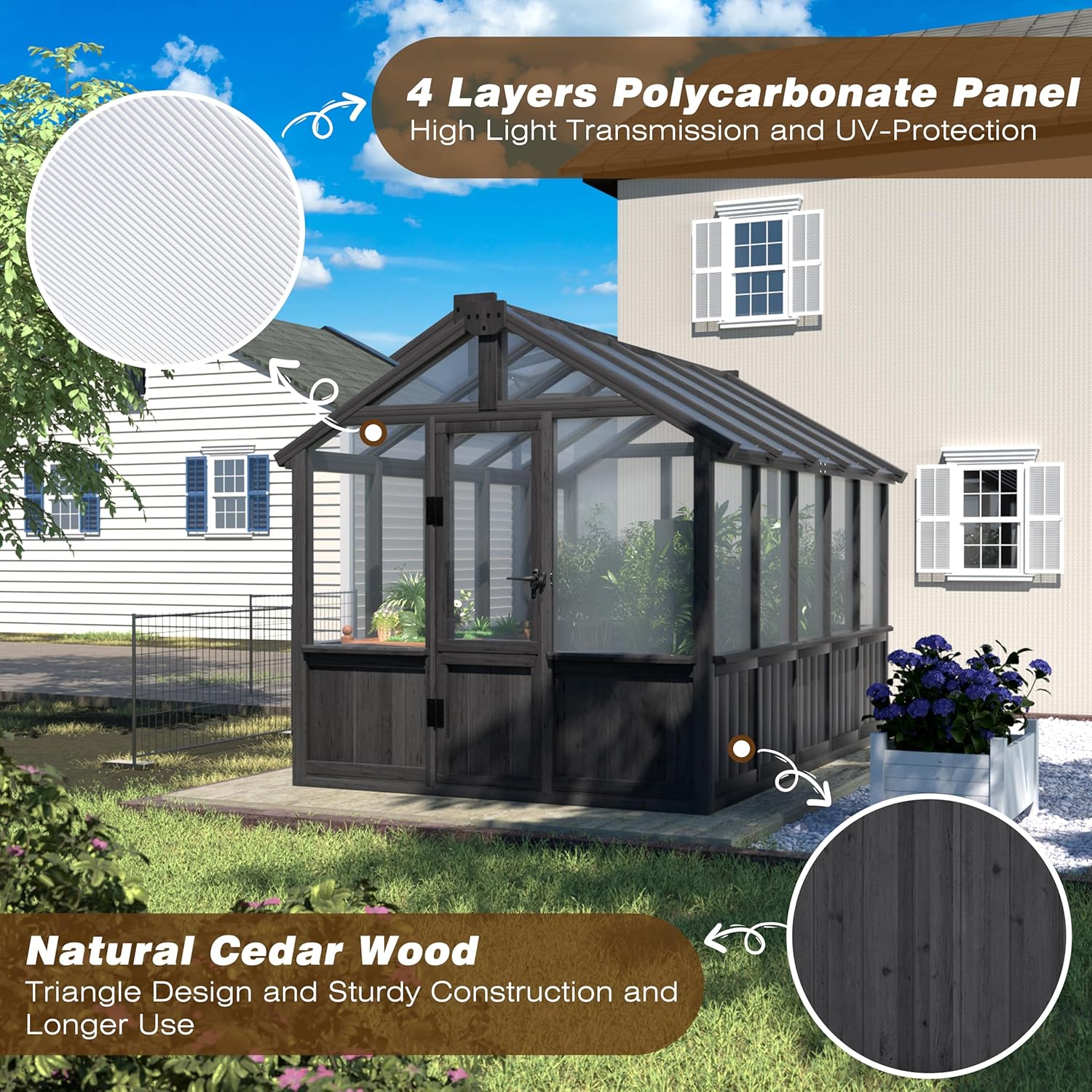 - Heavy Duty and Strudy Frame: The frame is stury to stand various weather conditions, it can be used not only on sunny days, but also on rainy and snowy days. Meanwhile, our wooden greenhouse also has a sturdy base support and reinforced construction