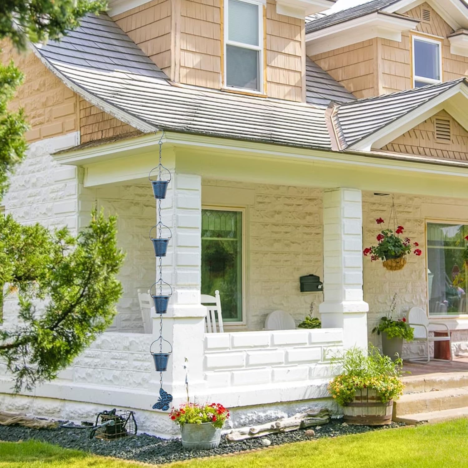- 16 Small Rain Cups with Butterfly Decoration: The set includes 16 exquisite small rain cups, each of which is carefully designed to guide the water flow to form a beautiful water curtain effect. What's more surprising is that the rain chain is also embellished with butterfly decorations, which are lifelike and add a touch of vividness and romance to the whole rain chain. When the rain flows slowly along the rain chain,