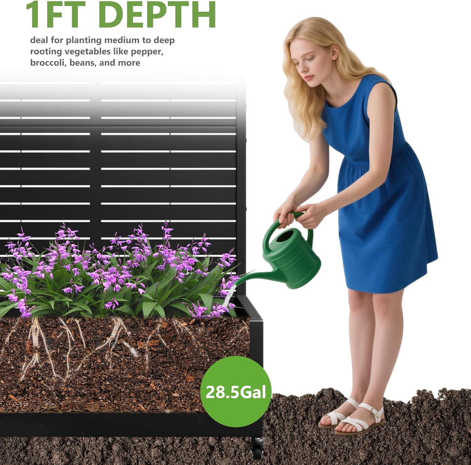 - Effective Drainage System: With a 12-inch deep planting bed and drainage holes, this planter prevents waterlogging, ensuring your plants receive the ideal moisture for healthy growth.