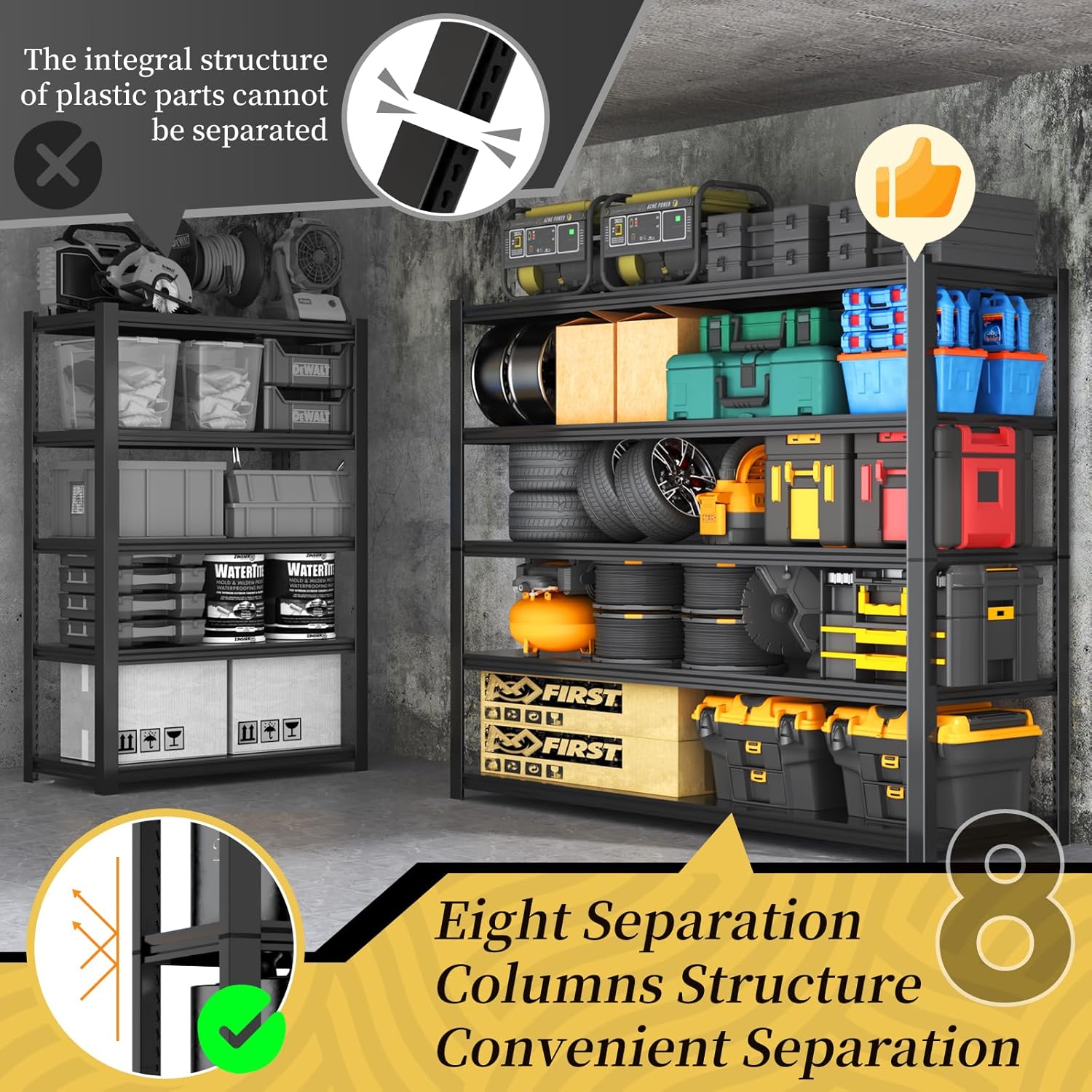 - Heavy Duty Garage Shelving Unit: This versatile shelving unit (47.8"W x 19.8"D x 72"H) is perfect for organizing tools, equipment, and supplies in garages, basements, warehouses, kitchens, or workplaces. It provides flexible storage solutions and ensures easy access to your items.