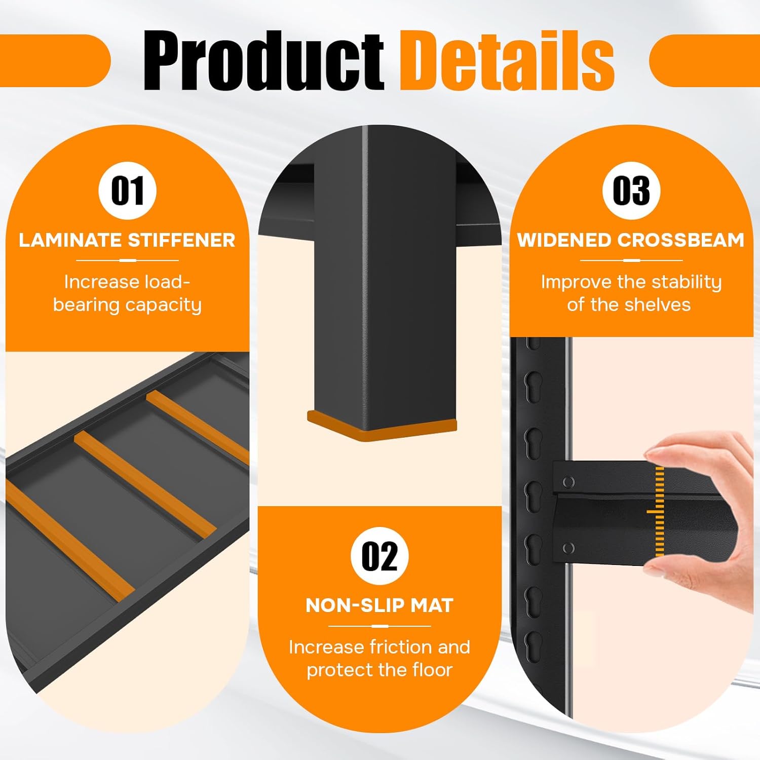- Upgraded Double-Layer Columns and Reinforced Beams: Unlike ordinary garage shelves on the market that use single-layer columns, our product features upgraded double-layer columns. Double-layered columns and reinforced beams ensure these garage shelves are exceptionally stable. Thanks to a scientifically engineered frame structure, weight is distributed effectively—eliminating concerns about shelving shifting or boards warping