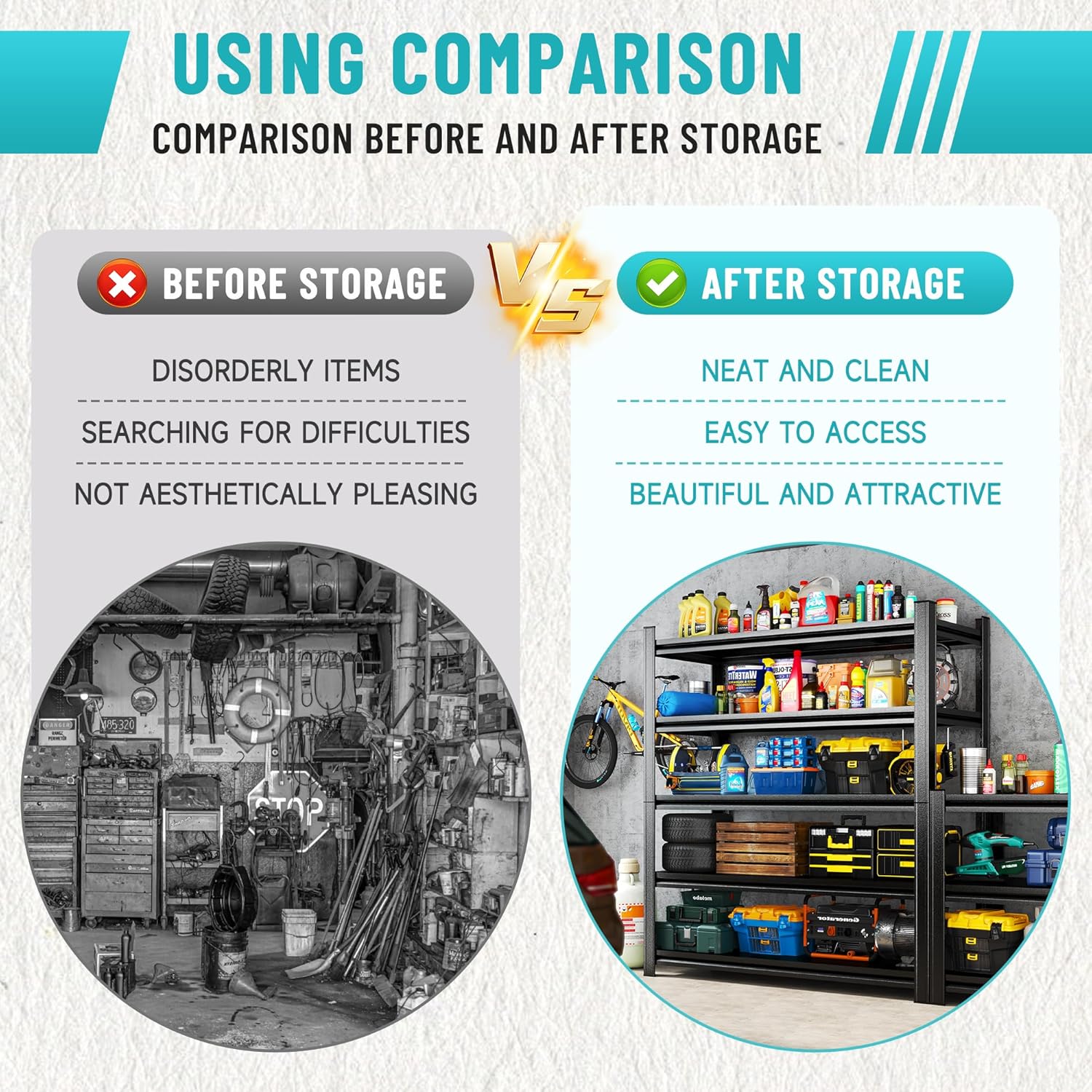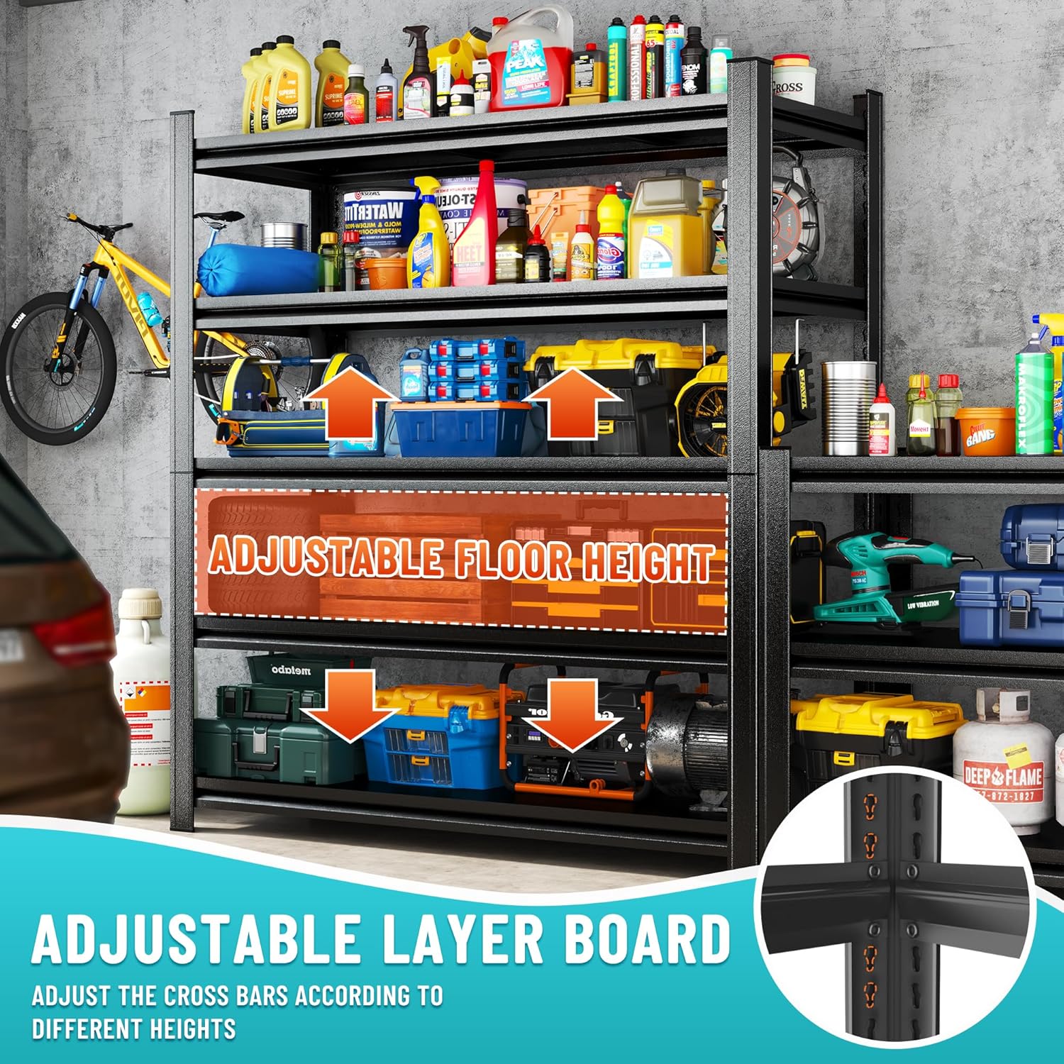 - 【Flexible Height Adjustment, Greatly Improve Space Utilization】This garage shelf can freely raise and lower the height of the five tiers of boards through the design of micro-adjustable slots, which can accurately match the different sizes of items from toolboxes and paint buckets to engines, containers and other items, and improves the utilization rate of each tier! The garage shelves are designed with tool-less adjustments, locking with the push of a finger, no need to remove bolts, and switching can be done in less than 30 seconds.